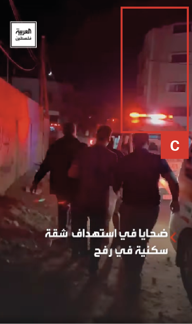 Reports of the incident mention the vicinity of a house for the Awaja family near Al-Zahraa Clinic in the Al-Geneina neighborhood, east of Rafah (منزل لعائلة عواجة بالقرب من مستوصف الزهراء في حي الجنينة شرق رفح). Analysing audio-visual material from sources, we have narrowed the location down to the following exact coordinates: 31.271658, 34.272094.